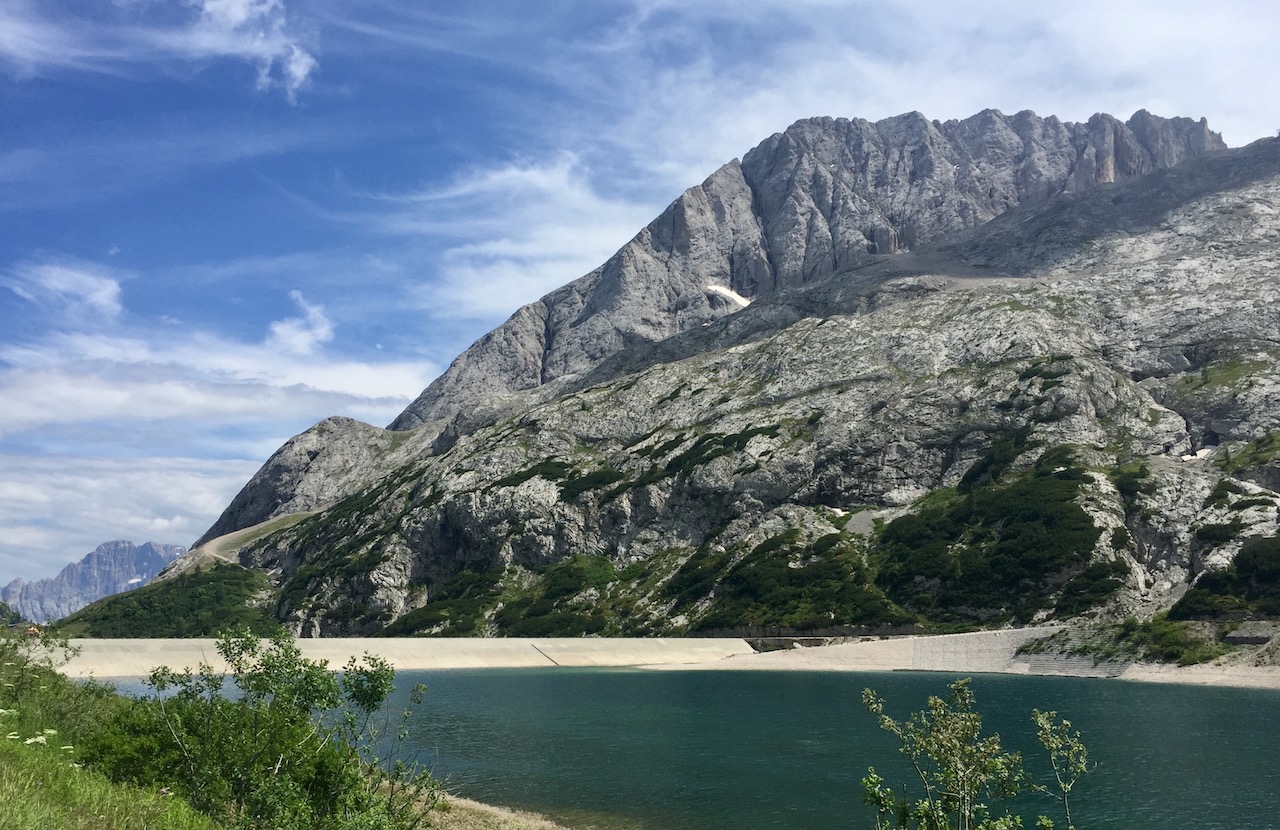 Wieder einmal erwartet mich nach so viel Mühe eine wunderbarere Belohnung. Der See von Fedaia und der Gletscher der Marmolada bilden eine unbeschreibliche Schönheit.