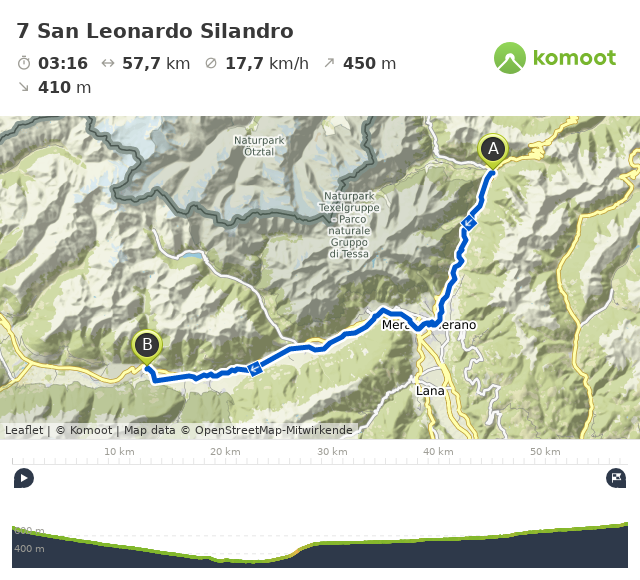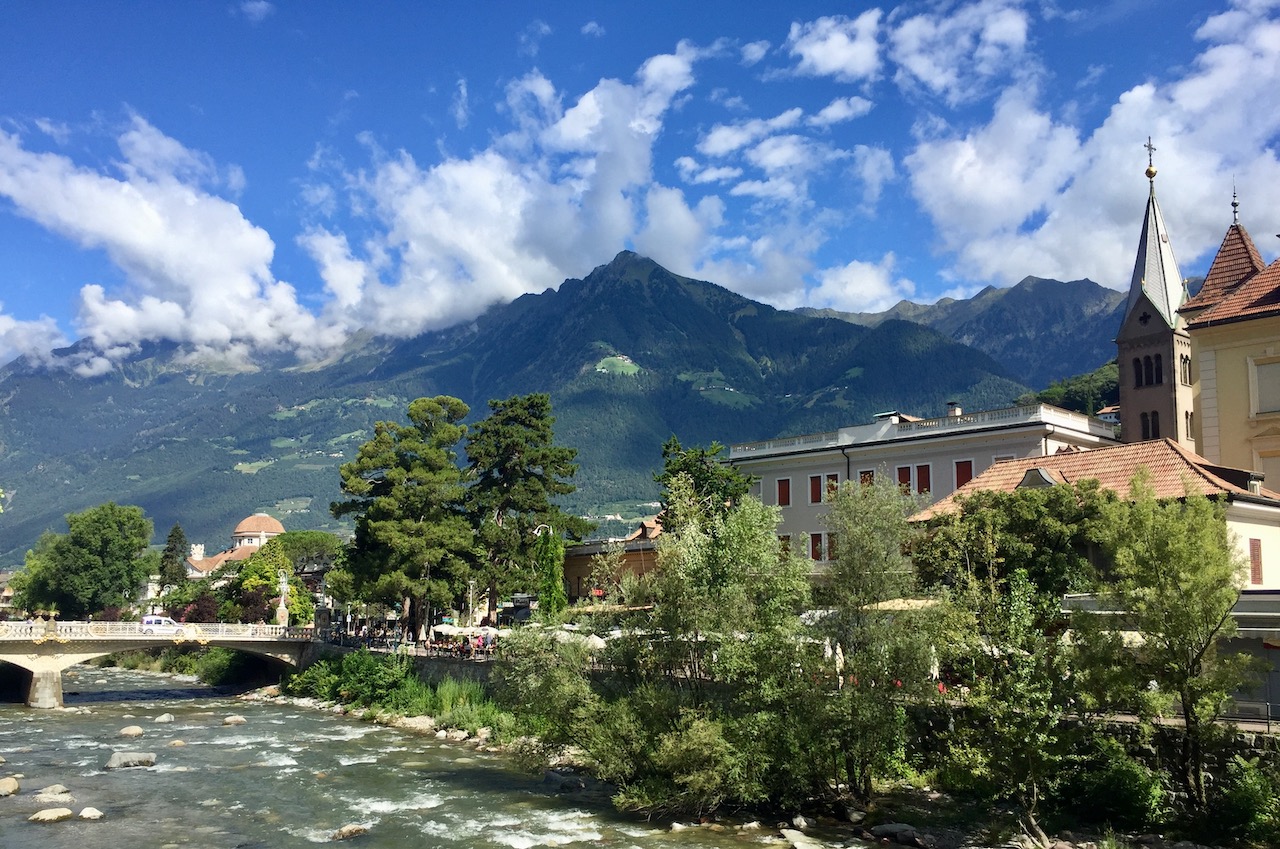 Nach Meran fahre ich fast immer bergab und bin ziemlich zügig unterwegs, bis ich an einem alten Mann vorbeikomme, der ruhig und seraphisch auswirkt. Was tue ich? Warum fahre ich so schnell? Heute ist ein wunderbarer Tag und die heutige Strecke ist nicht so lang: ich fahre langsamer und versuche, die Landschaft besser zu genießen. Vor den Toren von Meran bin ich im Wald und sehe die Schilder für den „Sissi-Pfad”. Die Kaiserin mochte diese Stadt sehr, sie lebte auf Schloss Trauttmansdorf und ging immer gerne in der Umgebung spazieren. Um das Zentrum von Meran zu besichtigen, muss ich einen Umweg fahren, aber es lohnt sich. Heute ist Sonntag und die Laubengasse ist fast leer, aber die Altstadt kann man immer bewundern. Auf dem Domplatz singt ein Straßenmusiker “Waht a wonderful world”. Wir vergessen dies zu oft und sollte jemand uns immer daran erinnert, wie schön unsere Welt wirklich ist. Wenn wir uns dieser Schönheit bewusst werden, lernen wir vielleicht, sie zu respektieren, diese Welt.