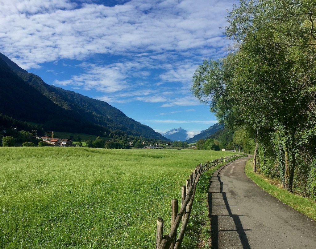 Heute keine Pässe, sondern nur eine Transferetappe. Das reichhaltige Abendessen von gestern hat mir Kräften zurückgegeben, die der Timmelsjoch mir geraubt hatte. Der Flusslauf war ein guter Begleiter meines Schlafes. Einige Gäste des Tirolerhofs beschwerten sich im Internet über den Lärm, aber für mich klang er wie eine schöne Melodie. Auch das Frühstück ist reichlich, der Himmel ist wieder blau und die Sonne scheint. Es sind ideale Bedingungen zum Radfahren. In St. Leonhard kann ich gleich den Radweg nehmen.