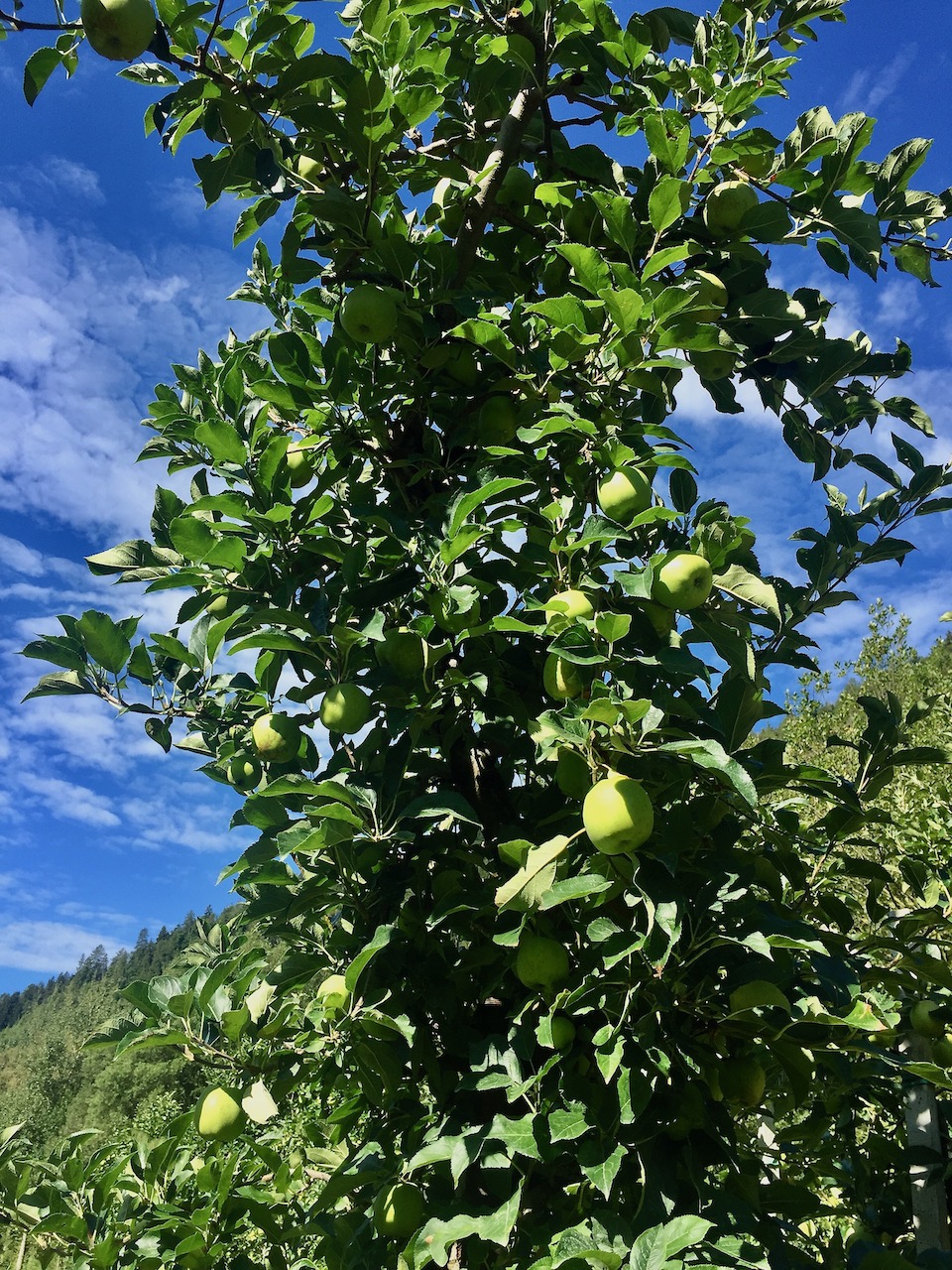 Il primo tratto è un misto di sterrato e di parti asfaltate. Si pedala sempre in riva la fiume ed il percorso è indicato alla perfezione. Più di una volta si cambia lato superando un paio di ponti e, dopo qualche chilometro, iniziano i meleti che mi terranno compagnia fino all’arrivo.