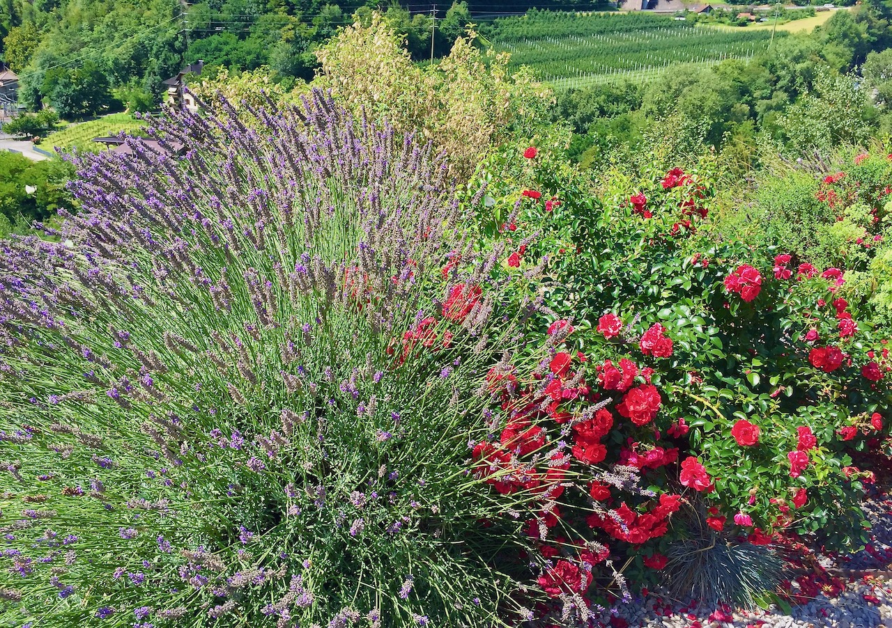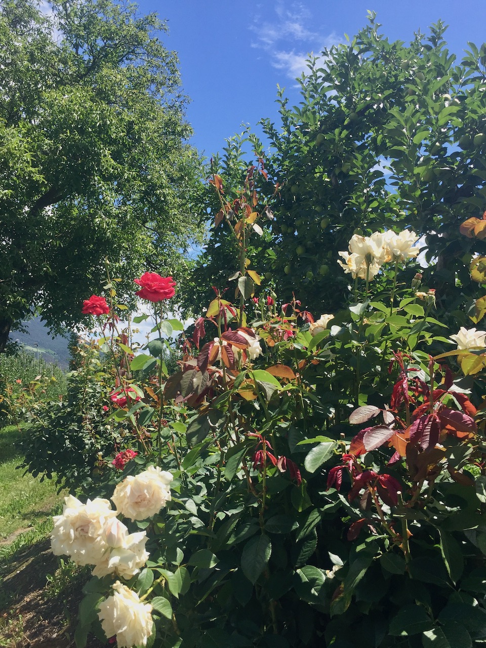 Am Anfang jeder Reihe git es Rosenpflanzen. Ein Geschenk für Passanten? Dies sind so genannte “Warnpflanzen”, weil die Rose von Schädlingen leichter angegriffen wird und Mineralstoffmangel aufzeigt.