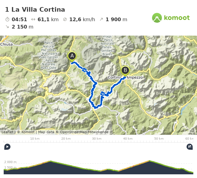 Ich würde gerne die Landschaft länger bewundern, aber der Wind und die Bergtemperaturen zwingen mich ins Tal zu fahren. Also, runter in Richtung Cortina. In Pocol wage ich ein Offroad auf der Skipiste, aber nachdem ich die Bremsen auf die Probe gestellt habe, komme ich in der berühmten Fußgängerzone an. Ich bin müde, aber das vergesse ich schnell und alles was bleibt sind Erinnerungen an eine wunderschöne Etappe.