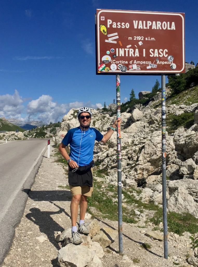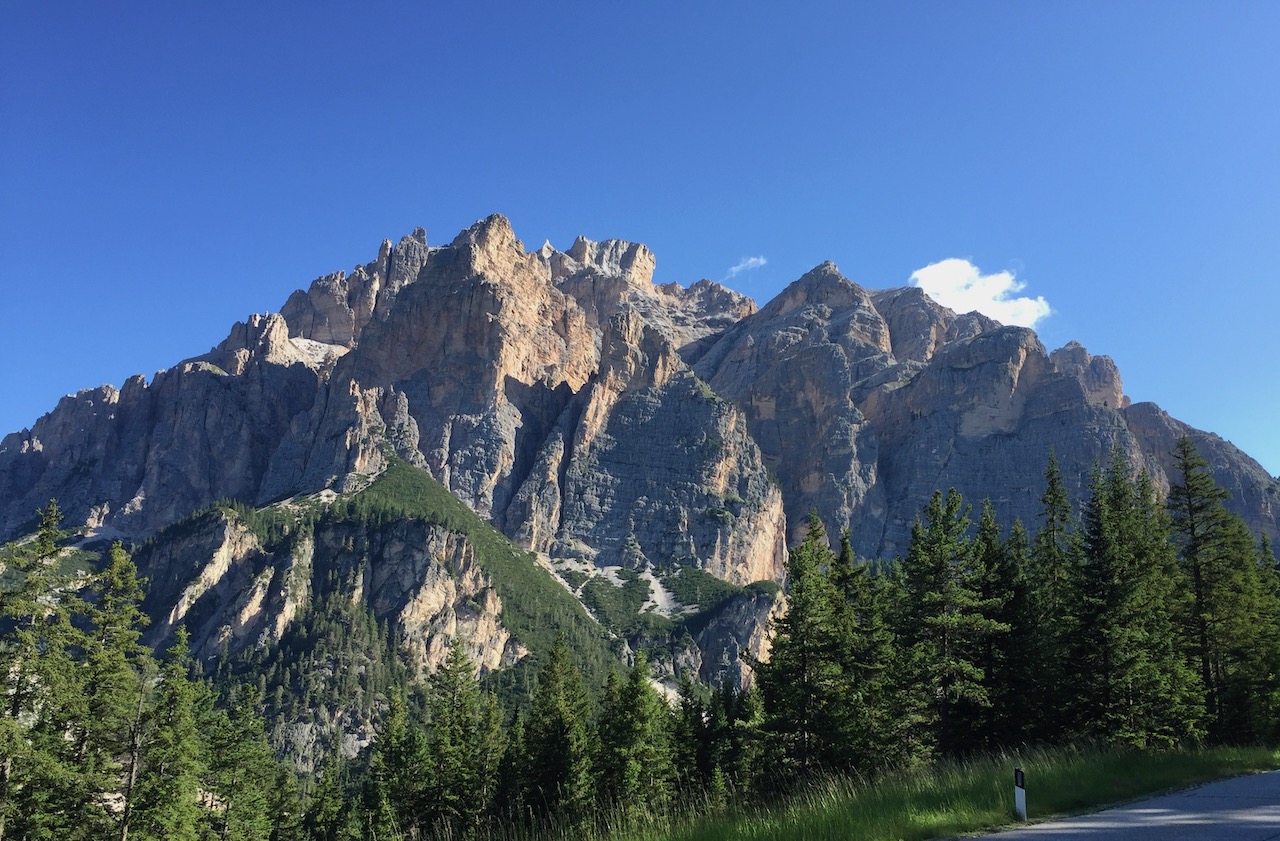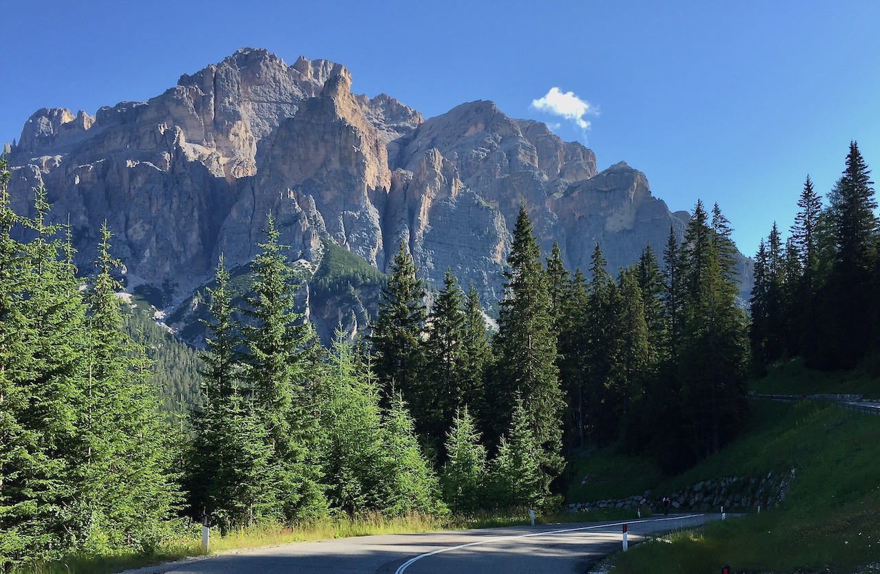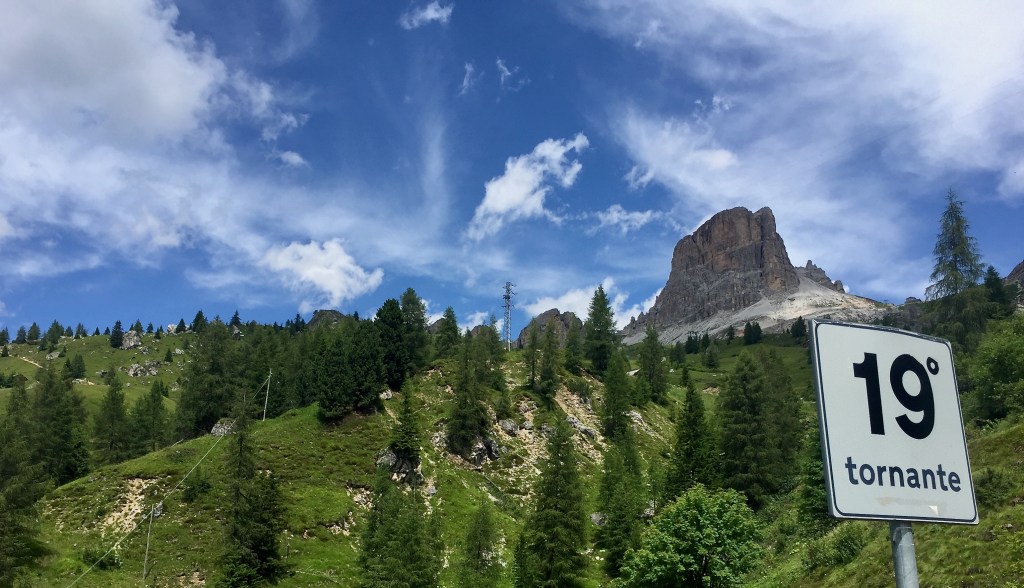 Che salita il Giau! Ma andiamo con ordine. Svegliarsi, aprire le tapparelle e poter ammirare lo spettacolo delle Dolomiti dal proprio letto non capita tutti i giorni e quindi mi prendo qualche minuto in più del previsto. La signora Romina del Garni La Ciasota (ieri ho potuto scrivere il post per il blog in giardino, comodamente sdraiato sull’amaca!) mi spiega che La Villa è una sorta di isola felice dal punto di vista metereologico perché capita spesso che nei paesi limitrofi piova risparmiando la località da dove partirà la prima tappa del mio giro. Poi mi conferma che in Val Badia fra la popolazione si parla il ladino ma tutti, o quasi, sono trilingui perché a scuola si impara il tedesco oltre, ovviamente, all’italiano. Il ladino mi ricorda vagamente il friulano, il mio dialetto e sento quasi aria di casa ma bisogna partire ed approfittare della bellissima giornata di sole.