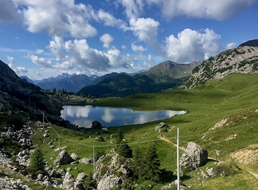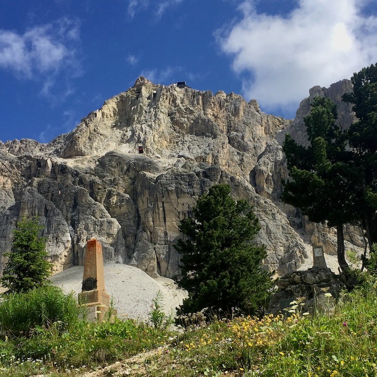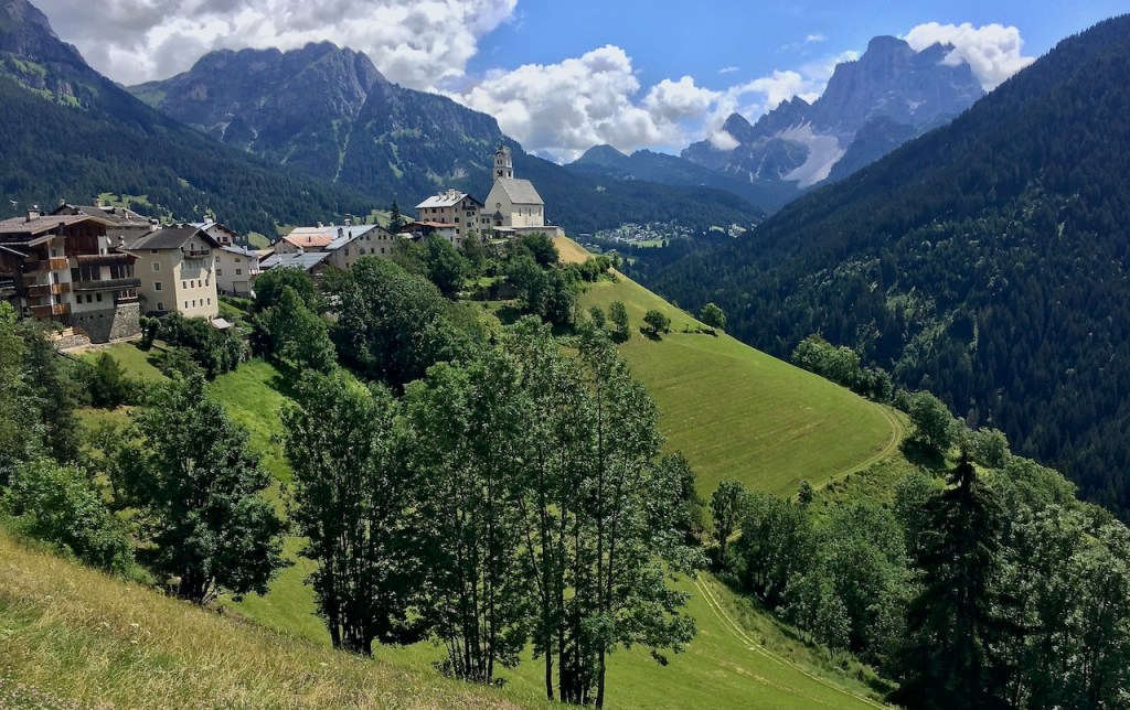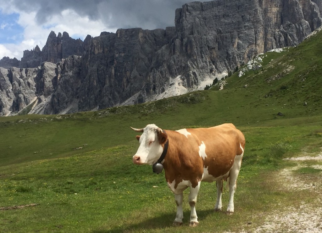 Was für ein Aufstieg der Giau! Aber der Reihe nach. Aufwachen, Fensterläden öffnen und das Schauspiel der Dolomiten aus dem Bett aus bewundern zu können: Es passiert nicht jeden Tag und ich muss mir ein bisschen Zeit nehmen. Frau Romina von Garni La Ciasota (gestern konnte ich den Beitrag für den Blog im Garten schreiben, bequem auf der Hängematte liegend!) erklärt mir, dass La Villa meteorologisch gesehen eine Glücksinsel ist. Es kommt oft vor, dass es in Nachbarort regnet und in La Villa die Sonne scheint! Dann erzählt sie mir, dass Ladinisch im Gadertal gesprochen wird, aber die Einwohnen (fast alle) dreisprachig sind. In der Schule wird nämlich Deutsch und natürlich Italienisch gelernt. Ladinisch erinnert mich vage an den fraulichen Dialekt, und ich fühle mich fast wie zu Hause. Ich muss aber los, um den schönen sonnigen Tag genießen zu können.