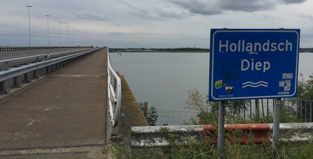 I primi chilometri sono lungo la Bassa Merwede, uno dei tanti fiumi del bacino del Reno, e mi fanno attraversare la zona portuale. Poi affianco la A16 ed il paesaggio non è molto interessante, fa invece una certa il ponte dell’autostrada con la ciclabile a fianco: evidentemente, quando lo hanno costruito hanno pensato anche alle due ruote. Certo, la balaustra potrebbe essere un po’ più alta, ma non si può avere tutto dalla vita!