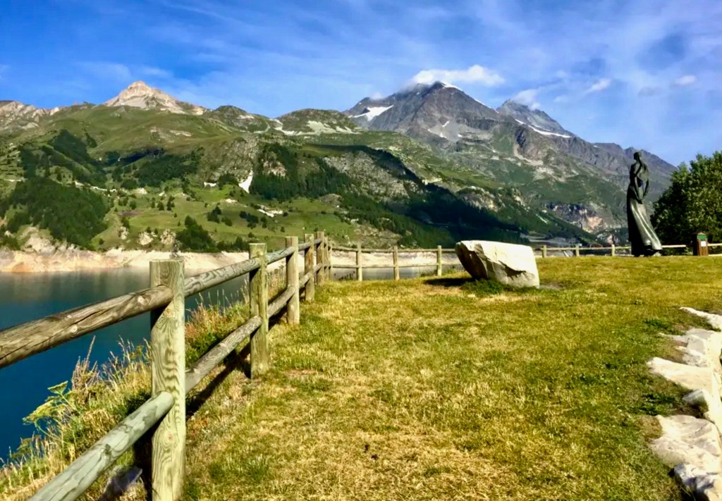 Nel 1952 venne costruita l’enorme diga dell’EDF. Gli abitanti provarono ad opporsi in tutti i modi ma alla fine dovettero cedere ed abbandonare le loro case. Il villaggio venne sommerso dal Lac du Chevril e, nel 2003 Livio Benedetti, uno scultore italiano ma savoiardo di adozione, diede le forme all’attuale custode dello specchio d’acqua artificiale. È la Signora del lago che indossa abiti tradizionali e guarda il villaggio che non c’é più, librando nell’aria una frase ricca di significato: „Semper Vivens“