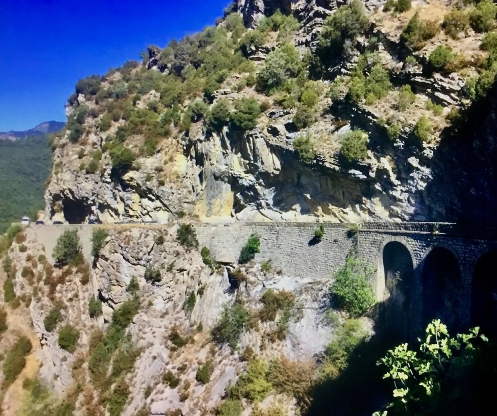 Vedo gli ulivi ed i vigneti. Faccio fatica a riconoscere il cartello del passo e subito dopo devo attraversare una galleria molto stretta. È corta ma dall’altra parte si ha davvero l’impressione di essere entrati in un nuovo mondo e di sentire l’odore del mare. Ora lo vedo, è là in fondo. Ma prima mi aspetta Castillon, un borgo abitato da artisti; „Citè des Artistes“.