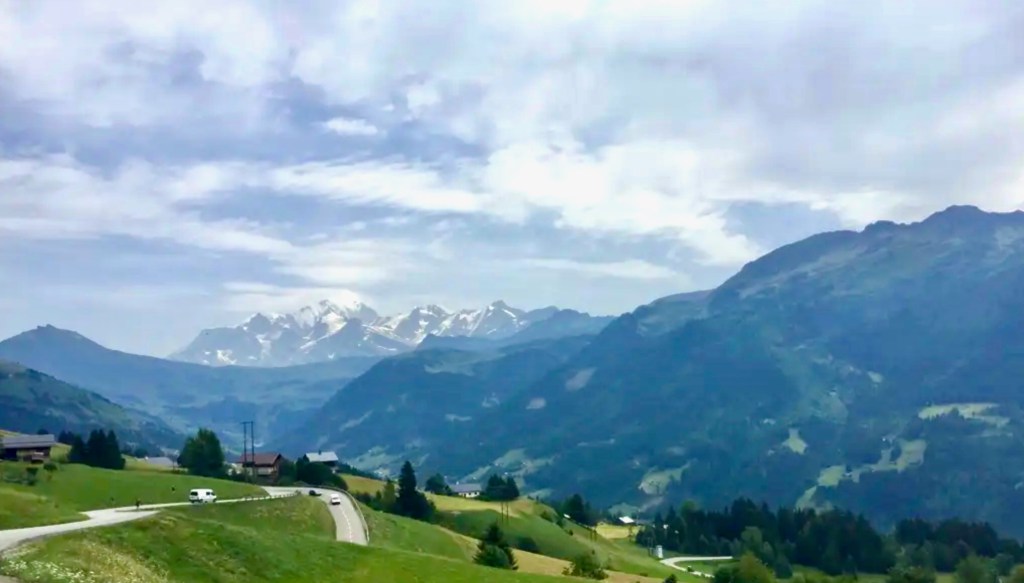 Lo spettacolo arriva in discesa. Qualche curva e mi appare in tutta la sua maestosità il massiccio del Monte Bianco. È lontano eppure appare così vicino. Stranamente famigliare, forse perché a scuola ne ho sentito parlare un milione di volte. Sono più le pause che i chilometri percorsi. Mi chiedo se una volta fosse stato più bianco, se l’uomo sia riuscito a fare danni anche lassù in alto. Probabile.