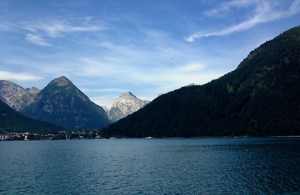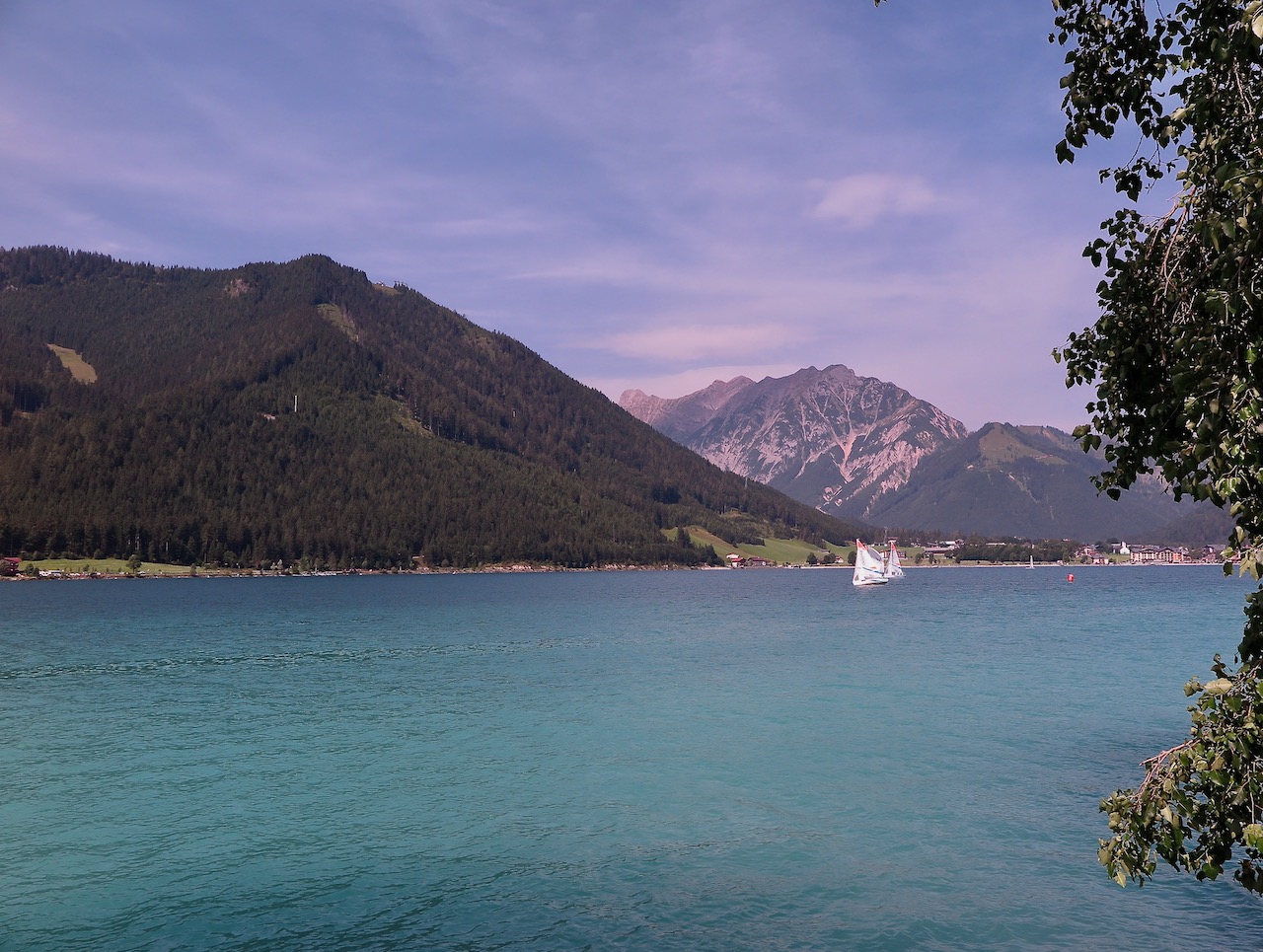 Siamo sull’Achensee una delle meraviglie delle Alpi austriache. Non è grandissimo e, pur essendo lungo una decina di chilometri supera di poco i mille metri in larghezza. Gli hanno affibbiato diversi soprannomi: „il fiordo delle Alpi“ o „il mare del Tirolo“. Ad Achenkirch sfociano nel lago i torrenti freddi di montagna e la temperatura dell’Achensee difficilmente supera i 20°C. Ma la purezza dell’acqua è eccezionale, tanto che si riesce a vedere ad occhio nudo fino ad una profondità di circa dieci metri. Ma ciò che più mi rimane impresso di questo specchio d’acqua sono i colori. Una bella giornata di sole riesce a regalare la magia di un mosaico con sfumature che variano fra il verde smeraldo, il turchese ed un azzurro che solo un lago di montagna riesce a creare.