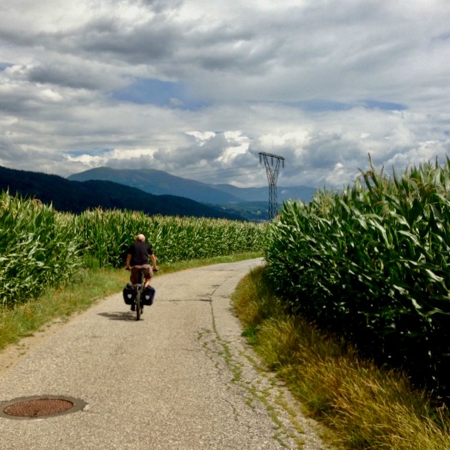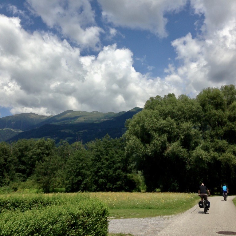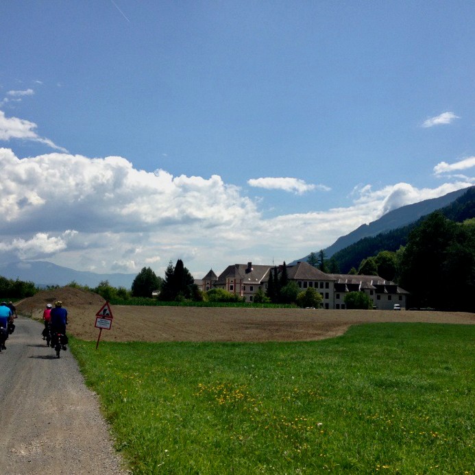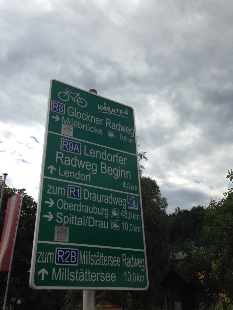 Le montagne, che ci circondano, ci guardano dall’alto e il percorso lungo il fiume ci fa da bussola. Dopo una trentina di chilometri arriviamo a Möllbrücke ed il cartello delle ciclabili sembra quello di un’autostrada. Ora siamo sulla Drava e a Spittal facciamo una piccola pausa per permettere a Carsten di comprare il biglietto del treno per il ritorno: sugli Intercity bisogna prenotare il posto per la bicicletta ed é meglio non aspettare l’ultimo giorno.