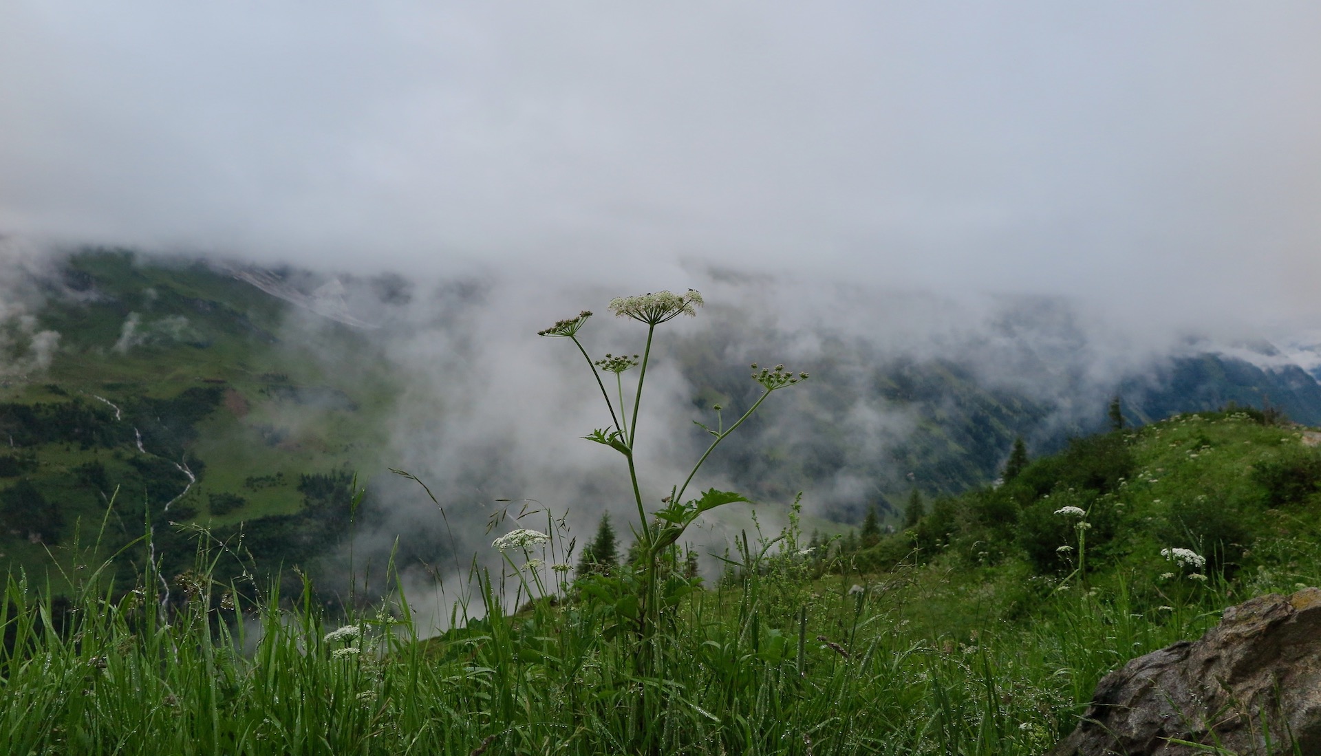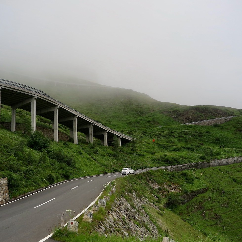 Die tiefhängenden Wolken verstecken teilweise die spektakuläre Aussicht, die Flavio und ich im Mai genießen konnten, als wir an einem schönen sonnigen Tag die Strecke uns angeschaut hatten. Auf der anderen Seite gibt es wenig Verkehr und die Motorradfahrer können an den Fingern einer Hand gezählt werden. Die Kehren scheinen endlos zu sein, und die Müdigkeit lässt die Pausen immer länger werden, aber der Zauber und der Reiz dieser Straße, die schon zur Römerzeit befahren wurde, beflügeln mich.