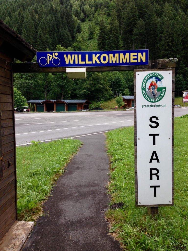 Jetzt geht’s los. Es gibt niedrige Wolken, und auch die Temperaturen sind nicht sommerlich: wie im November. Wenigstens regnet es nicht: Nur ein paar Tropfen zwingen uns die Regenjacken anzuziehen. Die Steigung ist gleich spürbar, und vor der Mautstation gibt es einen ersten Abschnitt mit 9%: eine Art Vorgeschmack auf das, was uns später erwartet. Zusammen fahren wir weiter bis zur Mautstelle, wo die Radfahrer einen separaten Eingang nehmen können. Auf dem Schild steht „Willkommen“ und „Start“: Wir sind nun auf der Hochalpenstraße und hier teilen sich unsere Schicksale. Jeder soll in seinem eigenen Tempo hochfahren und wir treffen uns dann an der Hütte vor dem Fuscher Tor.