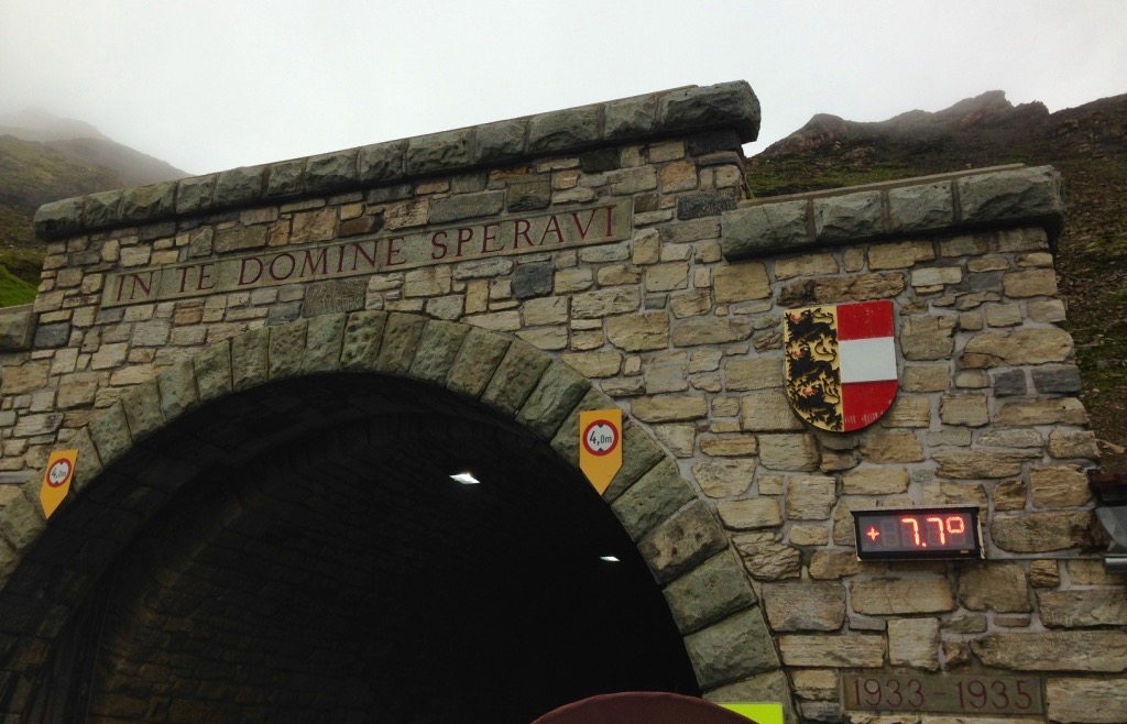 Una volta ricompattato il gruppo, ripartiamo per andare alla conquista del passo. A bordi della strada si inizia a vedere qualche tratto innevato ed il termometro della galleria prima dell’Hochtor è impietoso: 7,7°C.