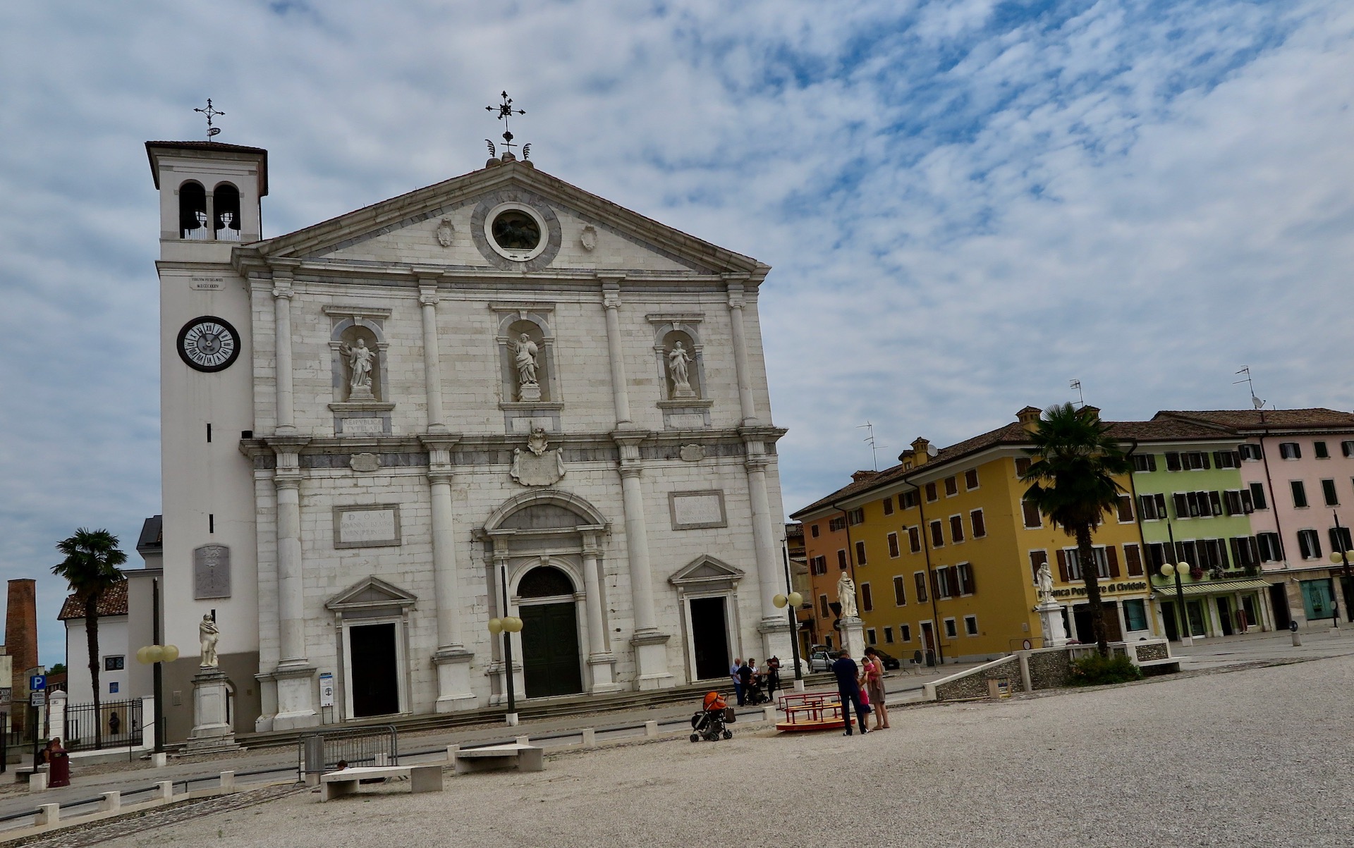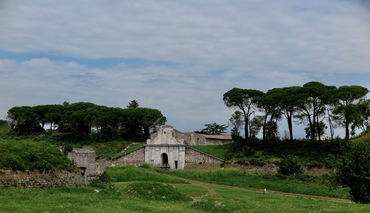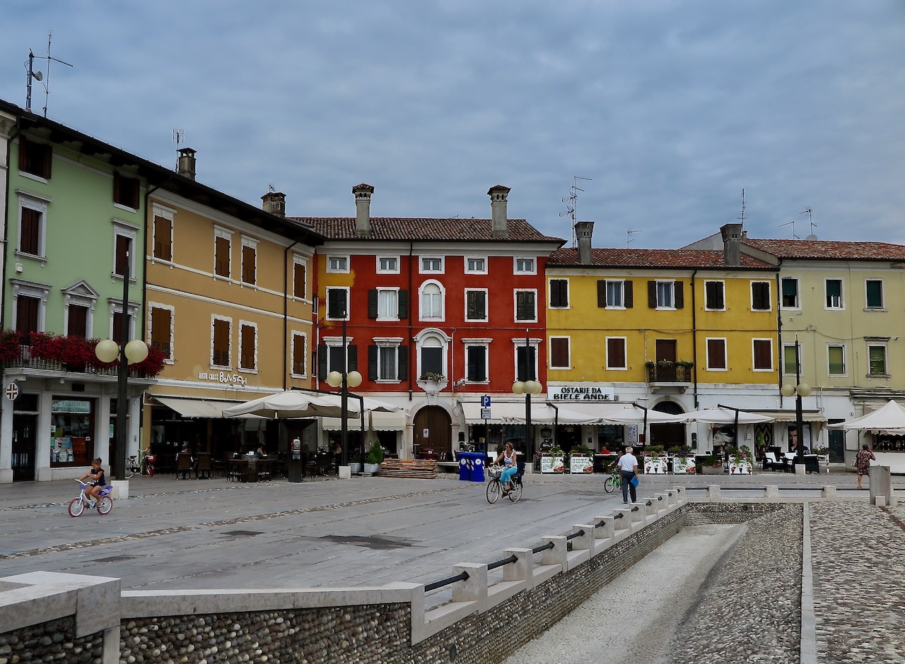 Senza accorgercene, arriviamo a Palmanova: la fortezza a forma di stella a nove punte costruita dai veneziani alla fine del 1.500, per difendersi dalle incursioni dei Turchi ma anche dall’Impero asburgico che aveva esteso il suo dominio alle zone limitrofe. Essendo in bicicletta non possiamo godere dello spettacolare colpo d’occhio che ci potrebbe regalare un drone ma, prima di uscire da una delle tre porte delle mura, troviamo il tempo per fare una piccola pausa in uno dei caffè della Piazza Grande. Un altro sguardo nei libri di storia ce lo concede Strassoldo, il borgo di origine medievale che diede i natali e diversi funzionari dell’Impero austro-ungarico e anche a Francesca Romana von Strassoldo-Gräfenberg, la moglie del maresciallo Radetzky.