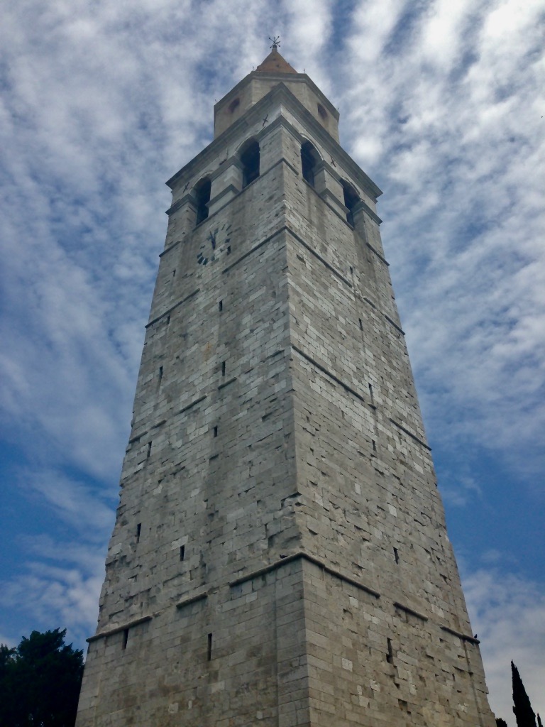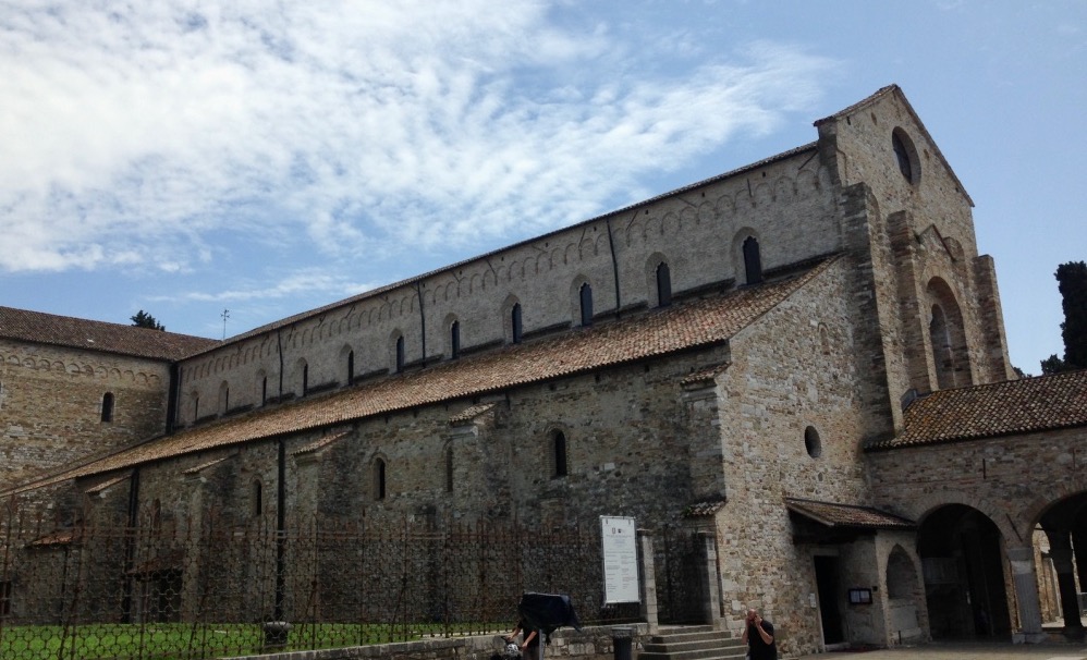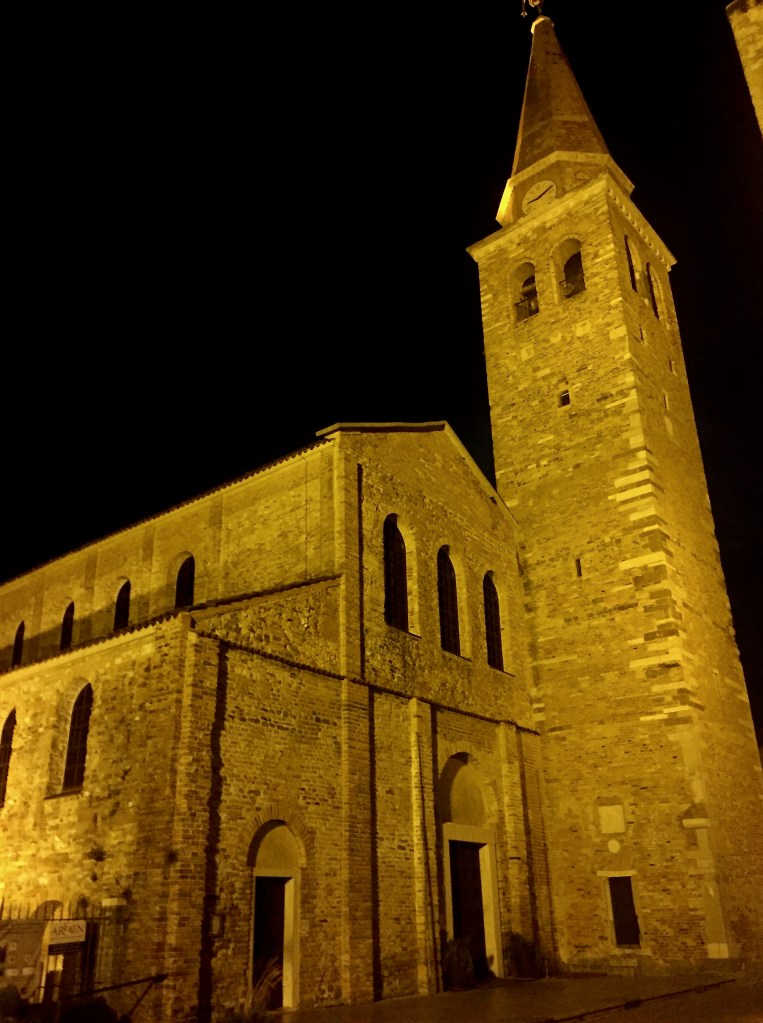 Da bambino, le antiche colonne del Foro romano di Aquileia mi preannunciavano l’odore della salsedine e, a scuola, ci insegnavano che era uno dei porti più importati centri commerciali dell’Alto Adriatico ai tempi dell’Impero romano. Allora la popolazione raggiunse i 200 mila abitanti. In lontananza vediamo il campanile della Basilica famosa per il mosaico pavimentale risalente al IV secolo: è il più esteso di tutto il mondo cristiano occidentale. Il primo edificio fu costruito nel 313 d.C. ma la basilica attuale è quella che venne consacrata nel 1031.