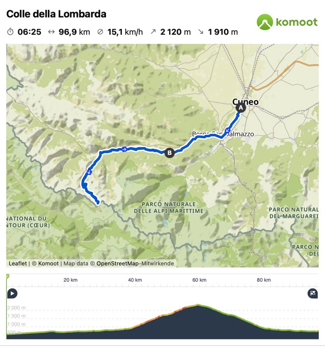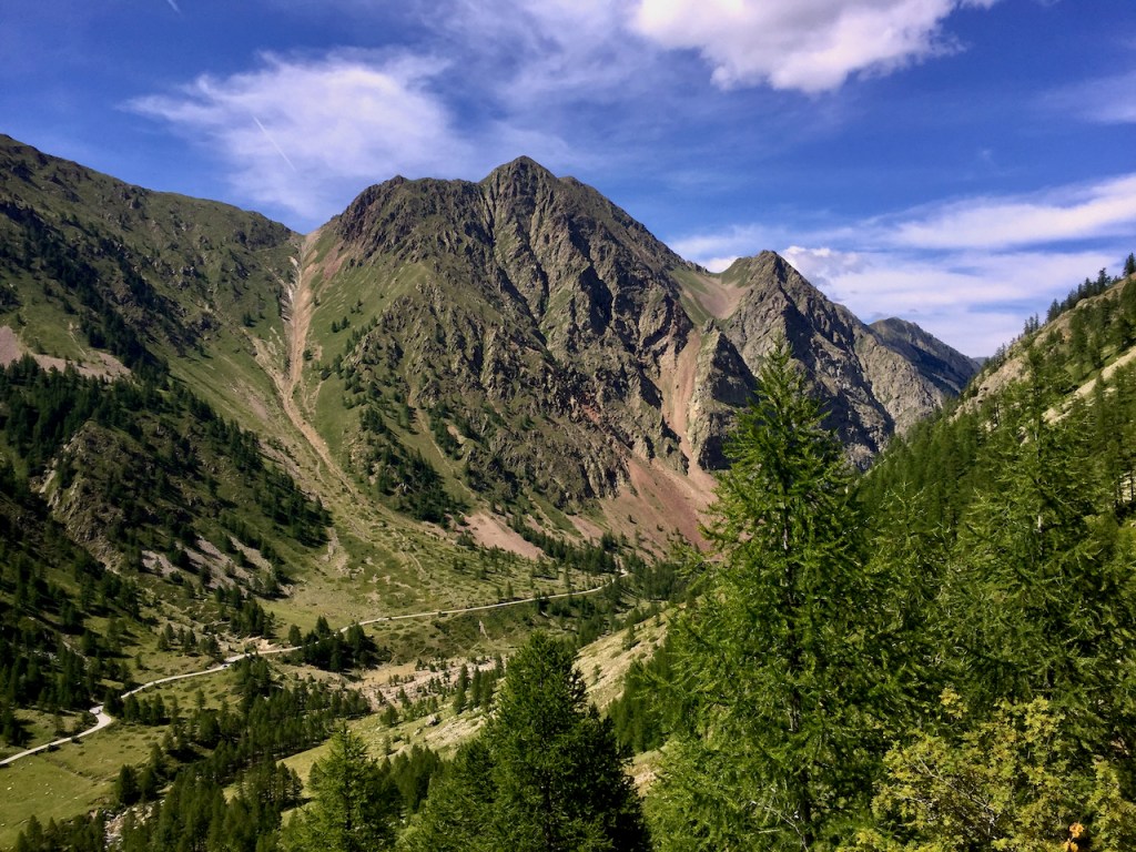 Essendo sul lato di Festiona posso percorrere la vecchia strada militare ed evitare la statale 21. Arrivato a Pratolungo, si inizia a fare sul serio ed imbocco la salita di circa 20 km e 1.400 metri di dislivello che mi porterà ai 2.350 metri della vetta. Una dozzina di serpentine fanno prendere quota ma poi le pendenze si addolciscono e solo raramente sono in doppia cifra.