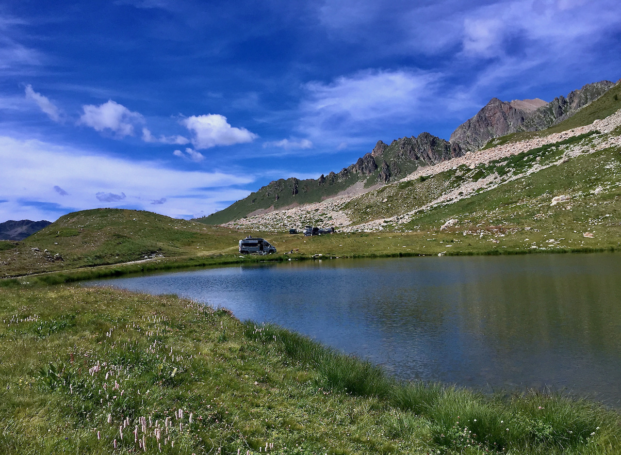 Nach den ersten 15 km Aufstieg erreiche ich die Abzweigung, die zur Wallfahrtskirche Sant’Anna di Vinadio führt, der höchstgelegenen in Europa. In den Alpen gibt es tatsächlich noch andere Kirchen in höheren Lagen, aber die sind nur zu Fuß zu erreichen, und für viele Radfahrer sind die 2020 Meter der Wallfahrtskirche ein Muss. Ich begnüge mich dagegen damit, sie aus der Ferne zu bewundern. Es ist der erste Tag und ich bin nicht in der Lage, meine Kräfte einzuschätzen: Ich fahre lieber in Richtung des Gipfels der Lombarda weiter und folge dem Schild “Francia”.